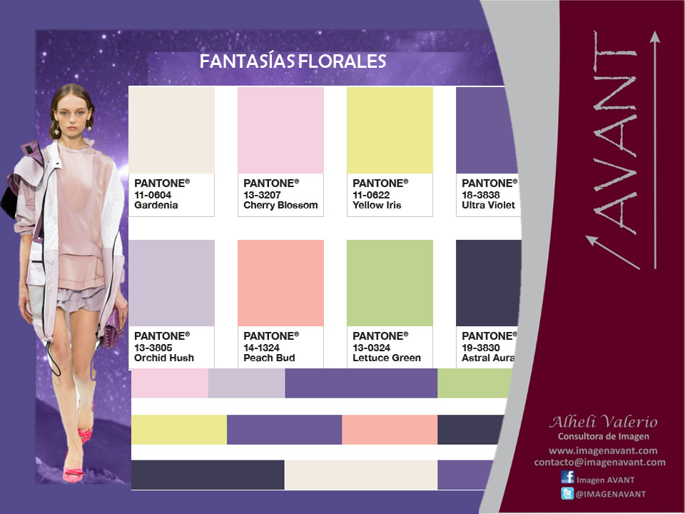 SI buscas un look fresco y luminoso puedes acompañar el ULTRAVIOLETA de colores claros, como puedes verlo en la paleta denominada Fantasías Florales.