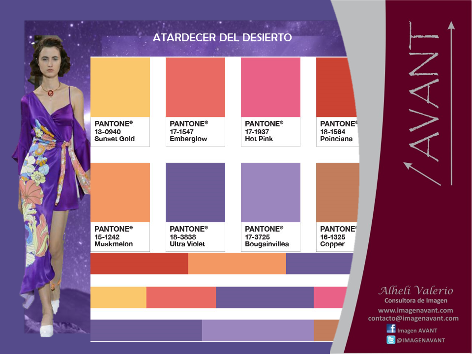 Si te gusta vestir con tonos cálidos y quieres usar el ULTRAVIOLETA, entonces la paleta inspirada en los atardeceres del desierto es la ideal para ti.