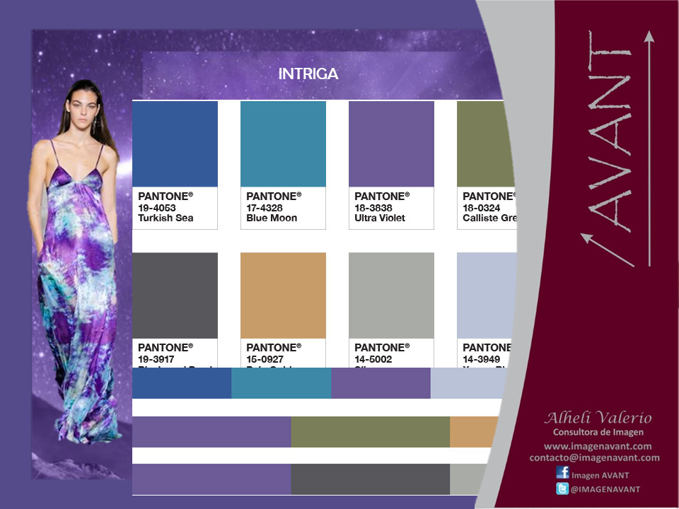 La combinación del ULTRAVIOLETA con azules, verdes y tonos metálicos son los que podemos ver en la paleta llamada Intriga y hace una total alusión a looks inspirados en el espacio.